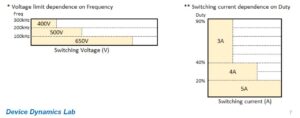 ** Switching current dependence on Duty: 5A (up to 20% duty), 4A (up to 40% duty), 3A (up to 90% duty).